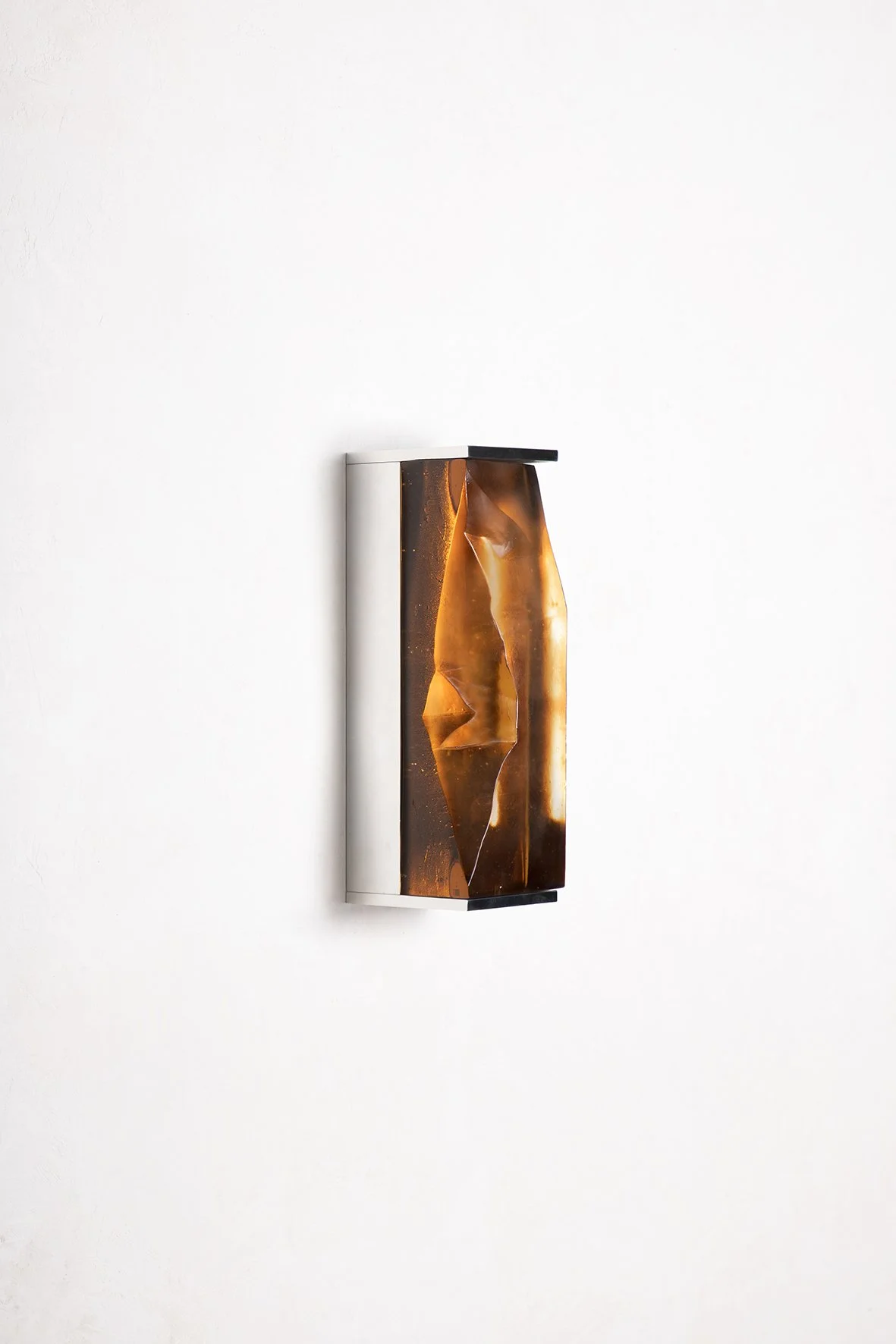 ITYS est le résultat d’une recherche sur les interactions entre le verre fondu à cire perdue coloré et la lumière. En fonction des épaisseurs du verre, du relief et du point de vue, la lumière crée des effets toujours uniques au sein et autour des appliques. Les bulles et voiles qui apparaissent de façon aléatoire pendant la cuisson du verre, renforcent encore la singularité de chaque pièce.