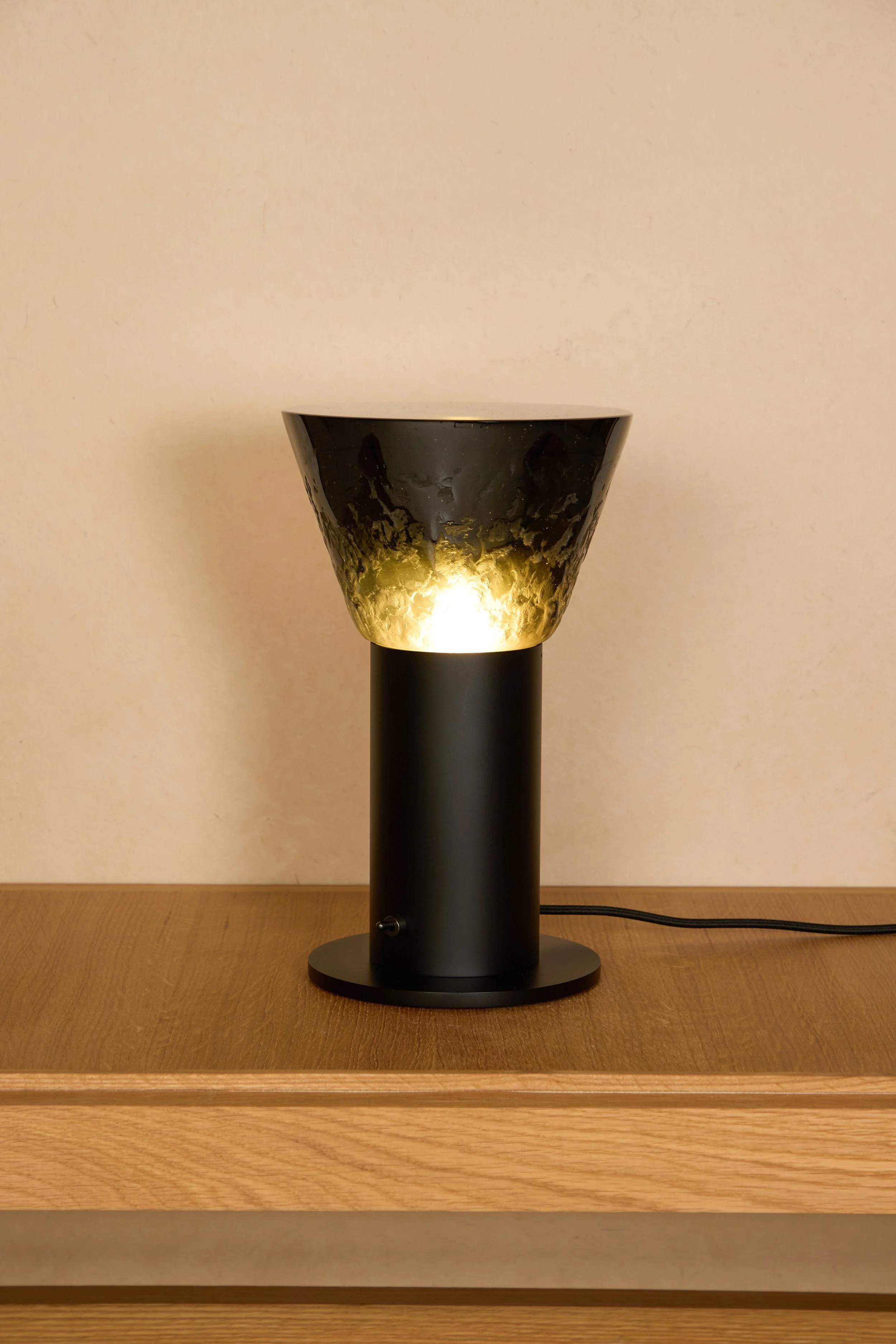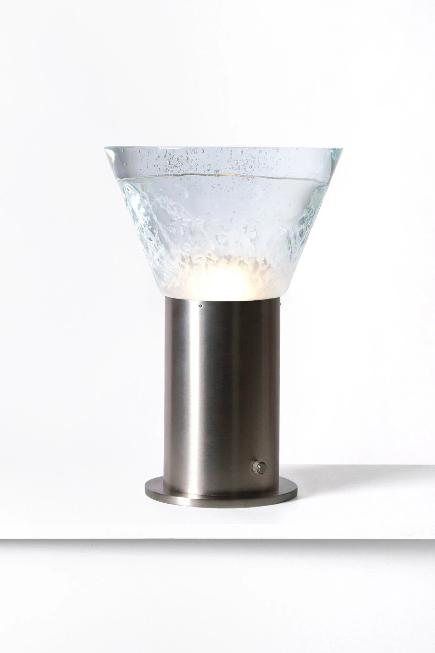 By combining a lost-wax cast glass cone and a patinated brass cylinder, PHORIA revisits pedestal like a sculpture installed on top of a round column. It comes in table lamp and floor lamp.
